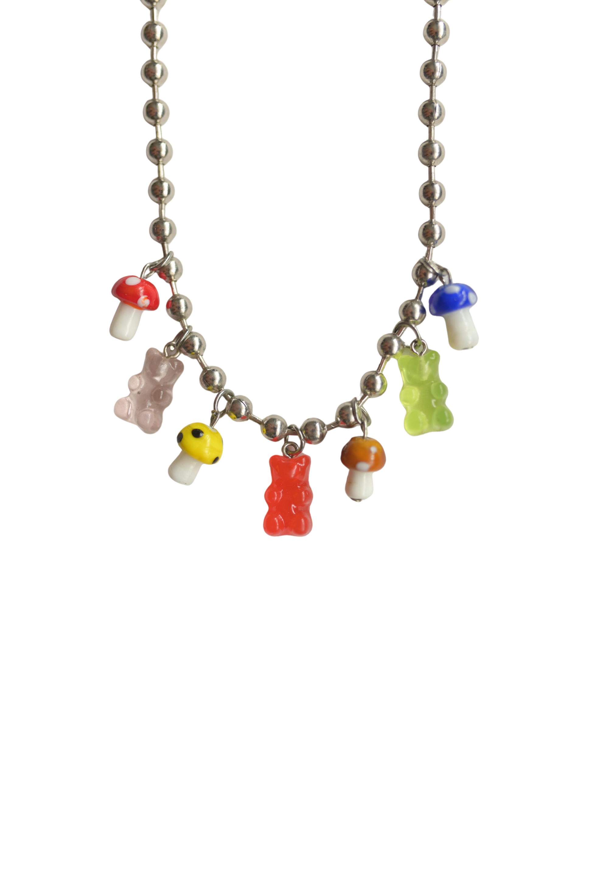 Playful and bold, the Gummy Shroom Charm Necklace blends nostalgia and street style in one vibrant piece. Featuring a stainless steel ball chain and an eclectic lineup of gummy bear and mushroom glass charms.