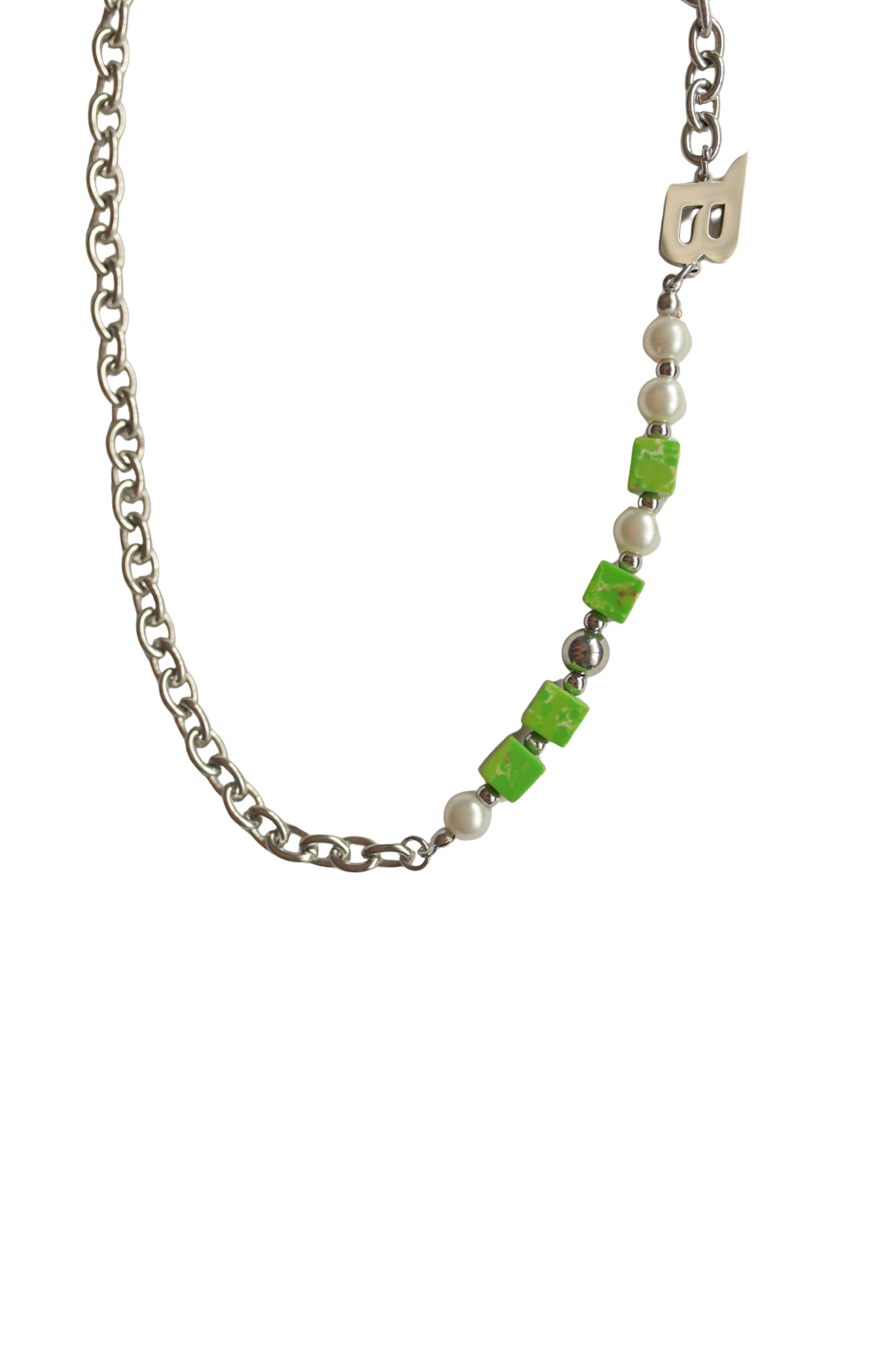 A Neon Stone Grid Necklace fuses polished stainless steel links with square-cut green stones and smooth metallic beads.