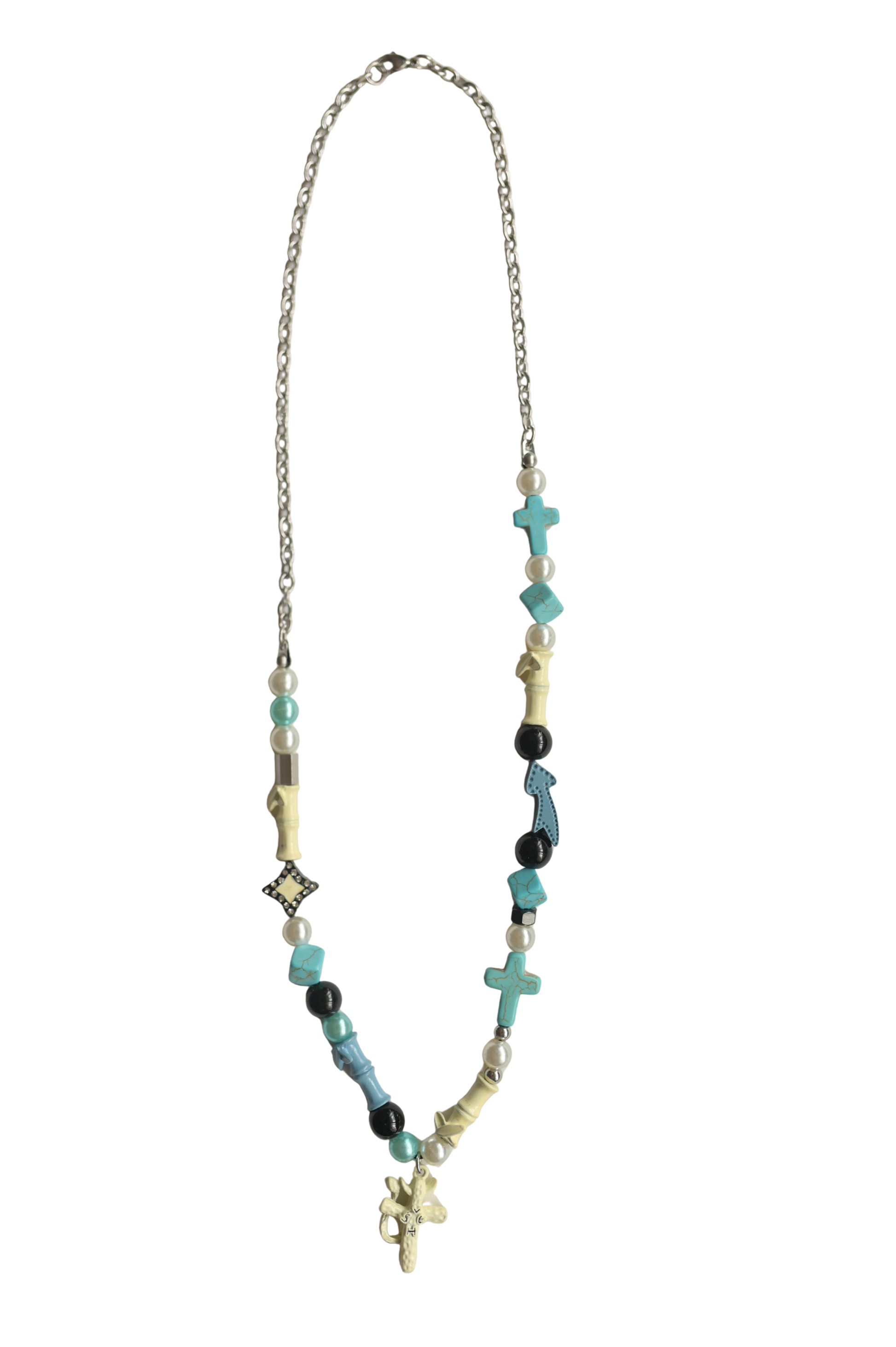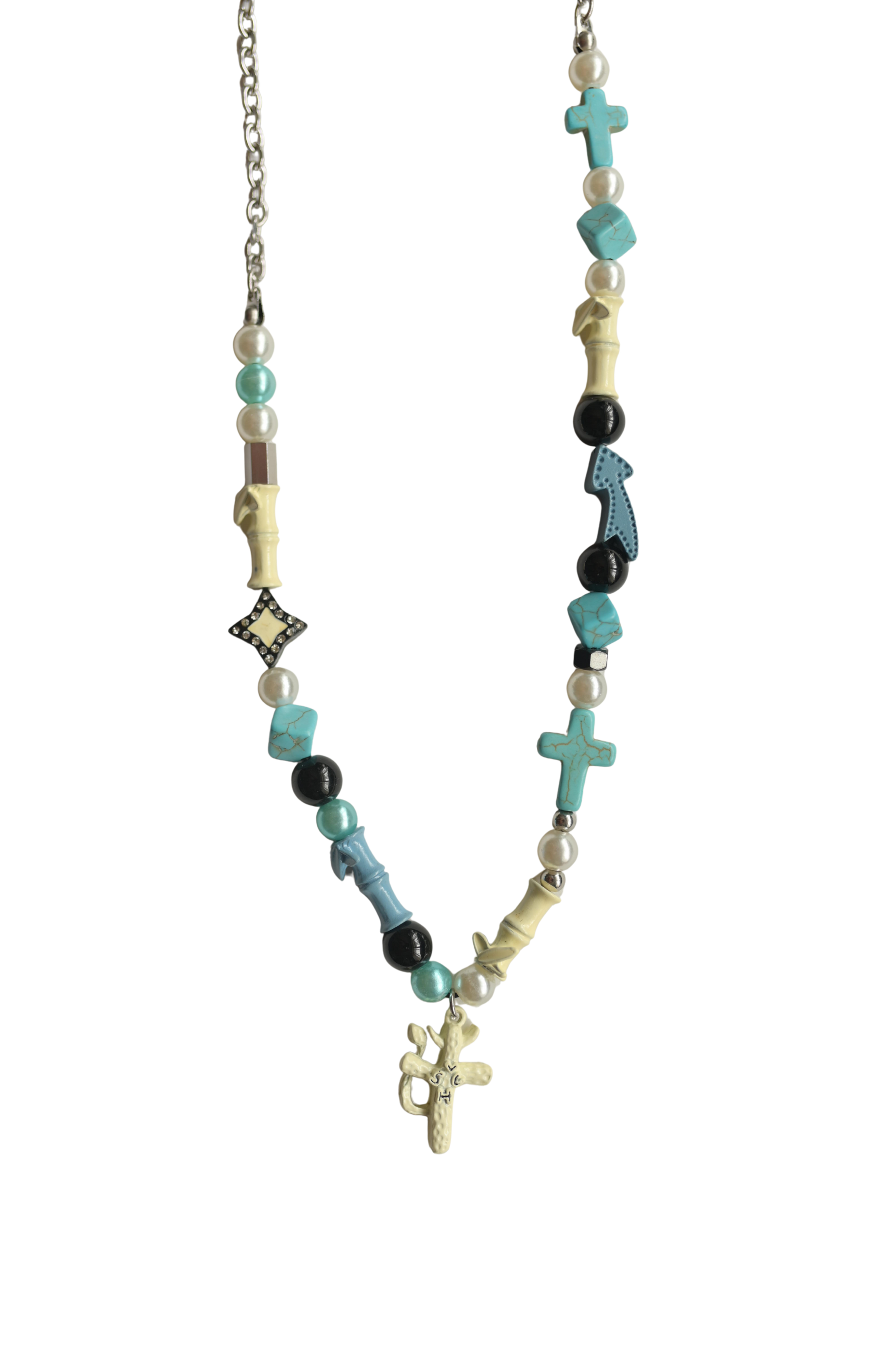 A handcrafted mix of cross, bamboo, and arrowhead beads in turquoise, ivory, and black tones.