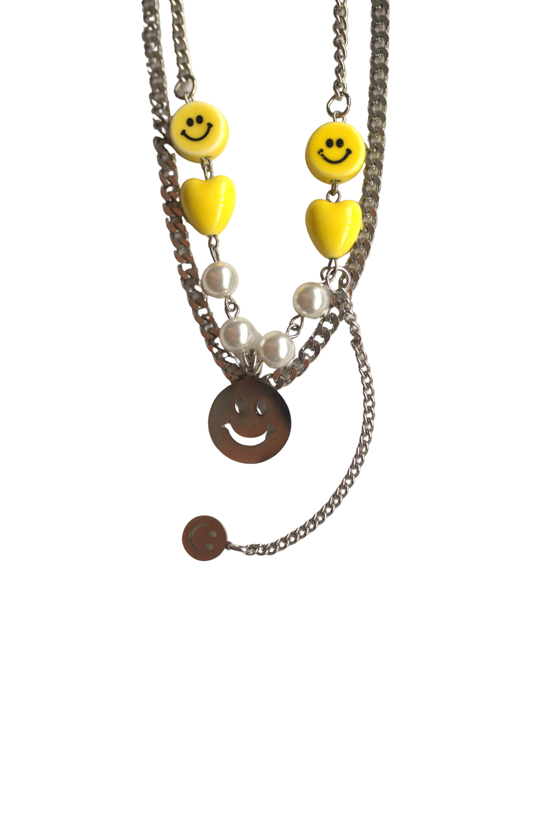 A bold layered chain design with pearly accents, yellow smiley faces, and playful heart charms, this piece radiates quirky positivity.